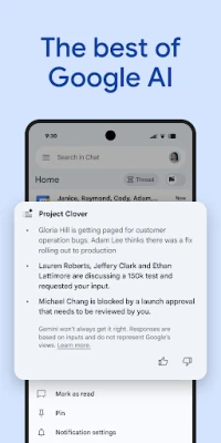 কাজের জগতে যোগাযোগের নতুন দিগন্ত উন্মোচন করতে Google Workspace নিয়ে এসেছে Chat, যা Gemini-র শক্তিশালী AI প্রযুক্তির সাহায্যে আপনার প্রতিদিনের কথোপকথনকে করে তোলে আরও বুদ্ধিমান ও কার্যকর। গুরুত্বপূর্ণ আলোচনার সারাংশ মুহূর্তেই জেনে নিন, যাতে কোনো তথ্য আপনার চোখ এড়িয়ে না যায়। ১২০টিরও বেশি ভাষায় স্বয়ংক্রিয় অনুবাদের মাধ্যমে আন্তর্জাতিক দলগুলোর সাথে নির্বিঘ্নে যোগাযোগ বজায় রাখুন, ভাষার বাধা অতিক্রম করে। AI-চালিত উন্নত সার্চের সাহায্যে আপনার প্রয়োজনীয় তথ্য খুঁজে বের করুন দ্রুত, এবং যেকোনো কাজের বিবরণ ক্যাপচার করে পুরো টিমকে সঙ্গে সঙ্গে অবহিত করুন।
